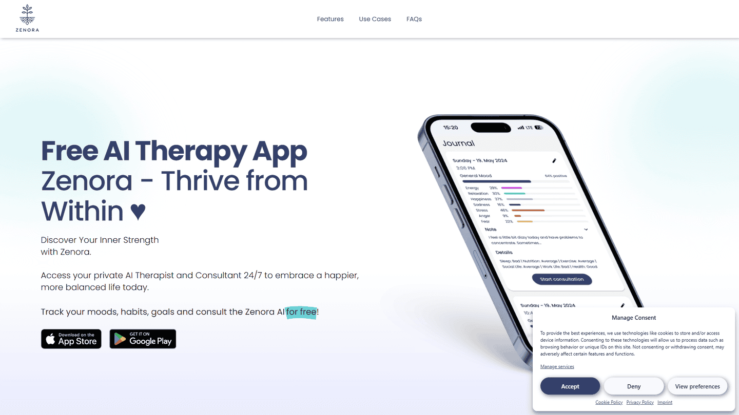 Zenora focuses on stress management, anxiety reduction, and mood improvement, assisting users in developing coping skills and promoting self-reflection.